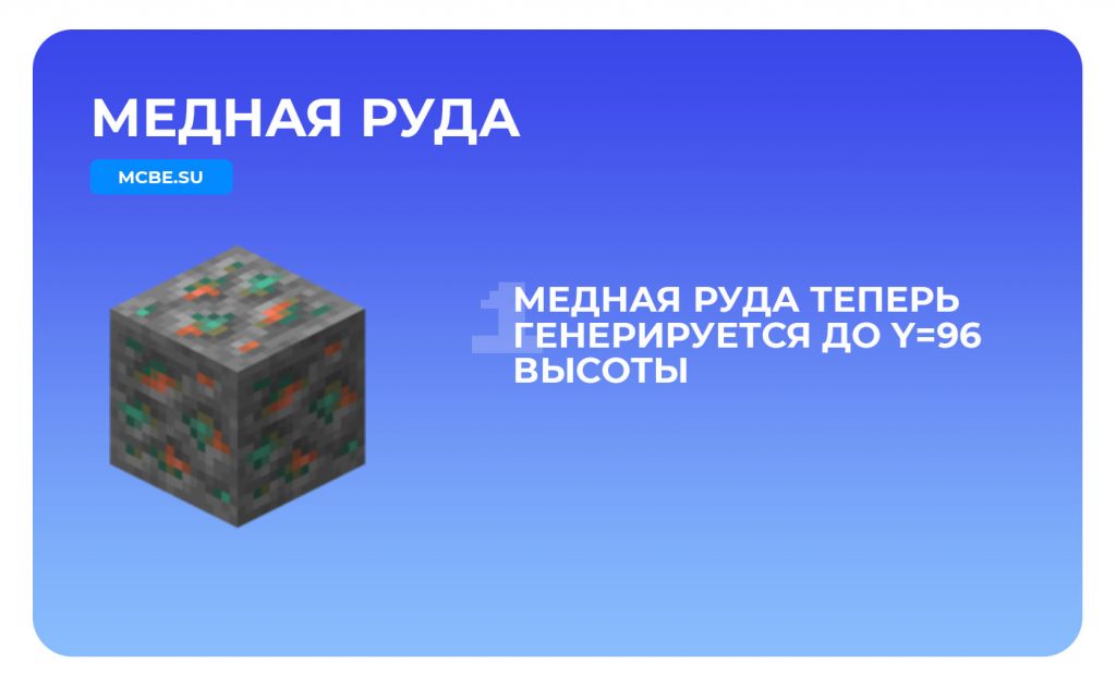 Медная руда теперь генерируется до Y=96 высоты, вместо Y=64. Вы сможете найти медь даже в горах, как уголь.