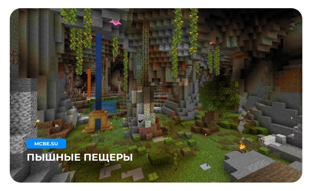 Пышные пещеры генерируются под землей. Найти их можно с помощью азилиева дерева. Это дуб с розовыми цветами на листве. Если прокопать под такое дерево то вы наткнетесь на пещеру. Вся пещера состоит из зелени, тут есть мох, светящийся ягоды, кусты, цветы и лилии.