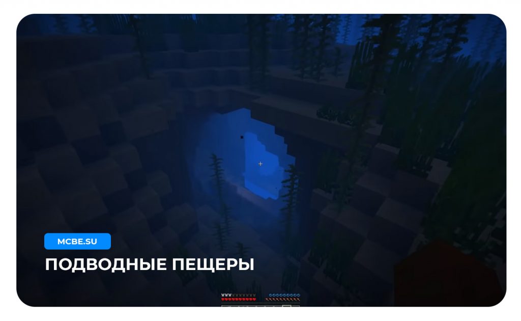 В морях теперь будут генерироваться подводные пещеры. Прямо под водой вы сможете найти вход в шахту, который полностью заполнен водой. Или разломы на дне воды. Подводные пещеры очень большие, в них есть рыба, также можно найти светящихся спрутов или аксолотлей.