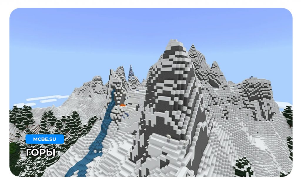 - Высокие горы – это большие возвышенности, которые есть в каждом биоме, на верху у них большой слой снега, а у подножья растет трава, выглядит также как и в жизни.