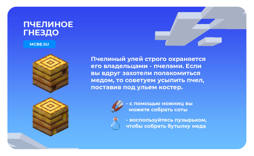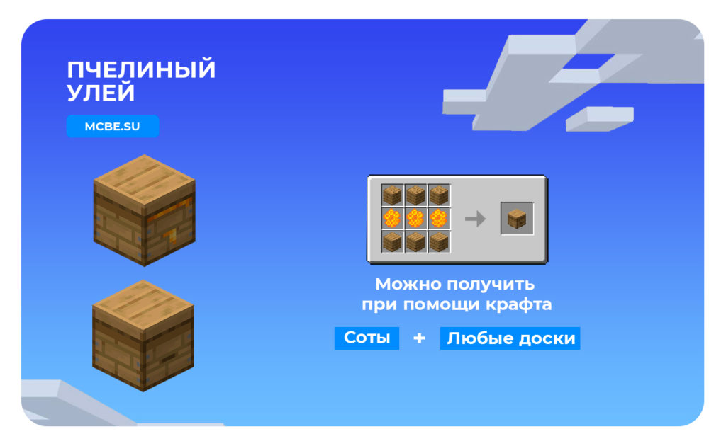 Пчелиный улей – жильё Пчёл. Получить можно с помощью крафта, собрать Соты и Банку мёда можно так же, как и с Гнезда.