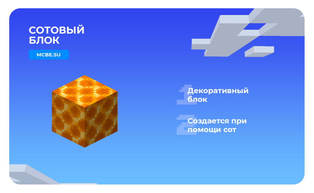 Сотовый блок – новый декоративный блок в нашей игре. Крафтится с помощью Сот. Играет исключительно декоративную роль.