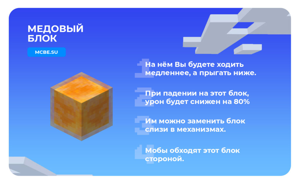 - В редстоун механизмах им можно заменить Блок слизи, так как Медовый блок двигает соседние ему блоки.