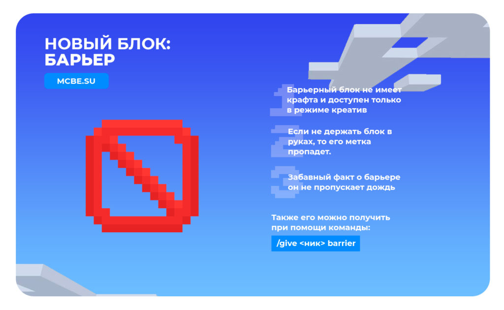 Теперь можно получить Барьер. У него нету никакого рецепта крафта, так как он доступен лишь в Креативе. Когда он у Вас в руках, вы видите его метку, убрав Барьер с руки – он станет абсолютно прозрачным. Одна из его интересных способностей – он не пропускает дождь. Получить можно с помощью команды: