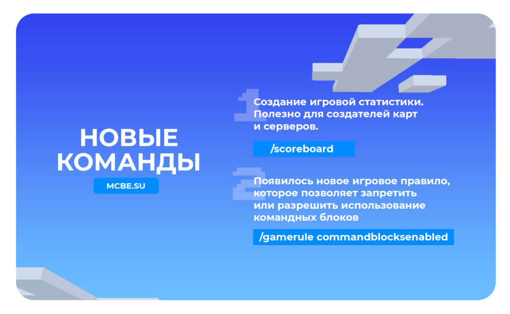 В игре нам завезли новую команду – /scoreboard. Это нововведение станет отличной новостью для создателей серверов или карт, которым необходимо собирать статистику об игроке.