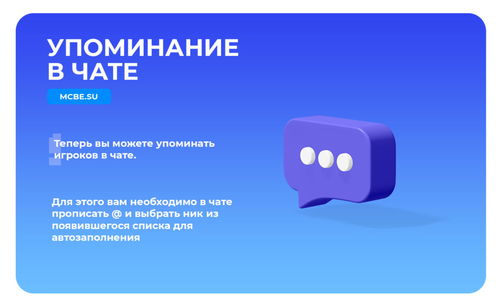 В чате стало доступно упоминание других игроков. Для этого нужно написать @ и появится список ников для автозаполнения.