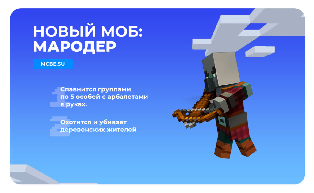 Первое, что мы заметили в обновлении, это новый моб – Мародер. Они появляются в любой области по 5 особей с арбалетами в руках. Мародеры охотятся и убивают деревенских жителей.