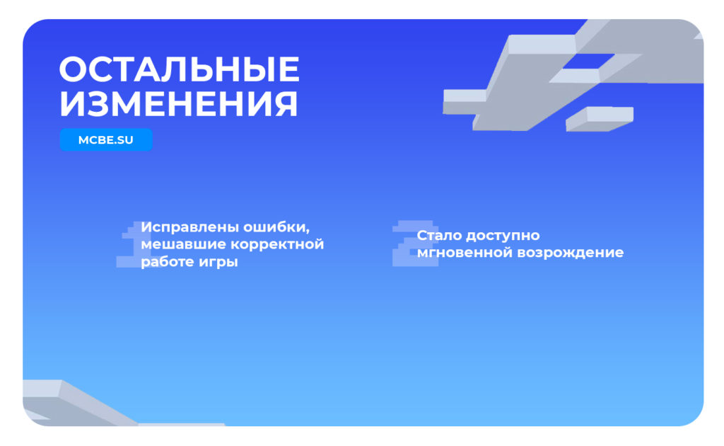 Как и в любом обновлении, было исправлено множество ошибок, мешавших нормальной работе игры. Стало доступно мгновенное возрождение, включить его можно командой либо в настройках мира.