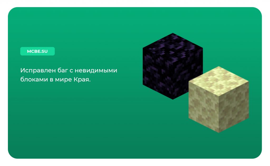 Было исправлено несколько сбоев которые могли произойти во время игры, например Minecraft PE 1.17.30.25 вылетал или зависал без видимой причины. Исправлен баг с невидимыми блоками в Краю.