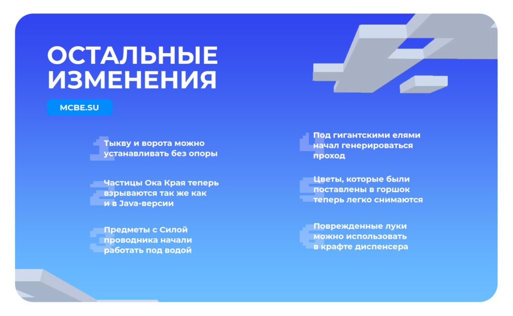 Была проведена огромная работа над фиксом багов и лагов, тем самым повысив производительность игры. Читайте наш подробный обзор новой версии Майнкрафт