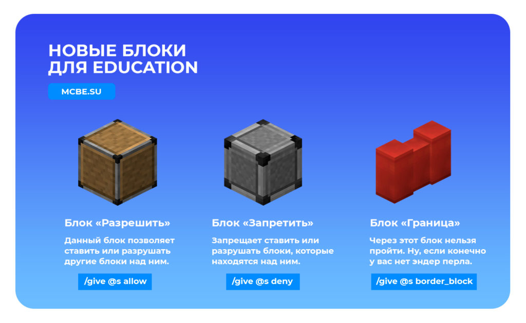 Добавлено для режима Education Edition. Ими можно ограничивать действие игроков. Краткое описание: