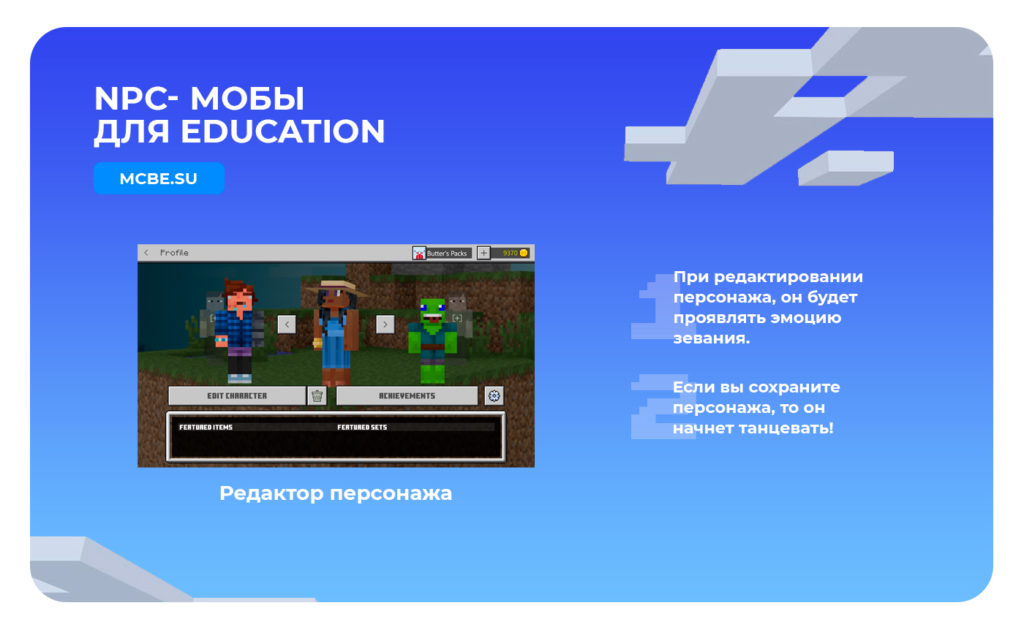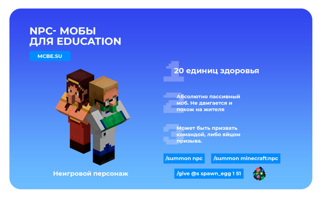 Доступна полная настройка моба: отображаемый текст, диалоговое окно, 20 вариантов внешнего вида, настраиваемая кнопка для взаимодействия, поэтому моб отлично подходит для создания каких-либо квестов.