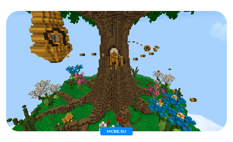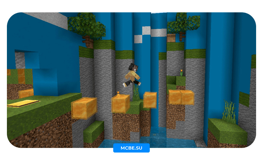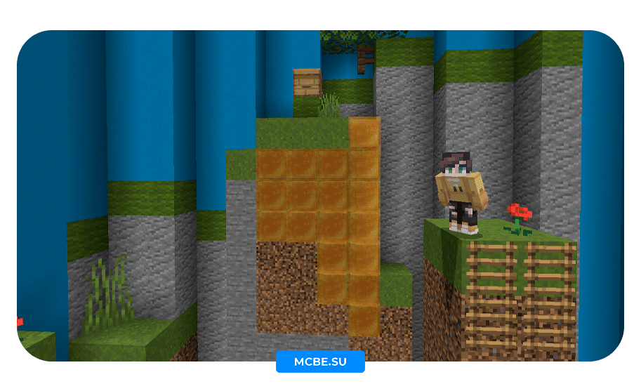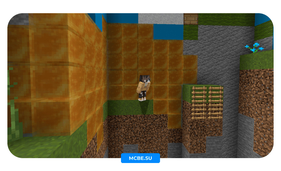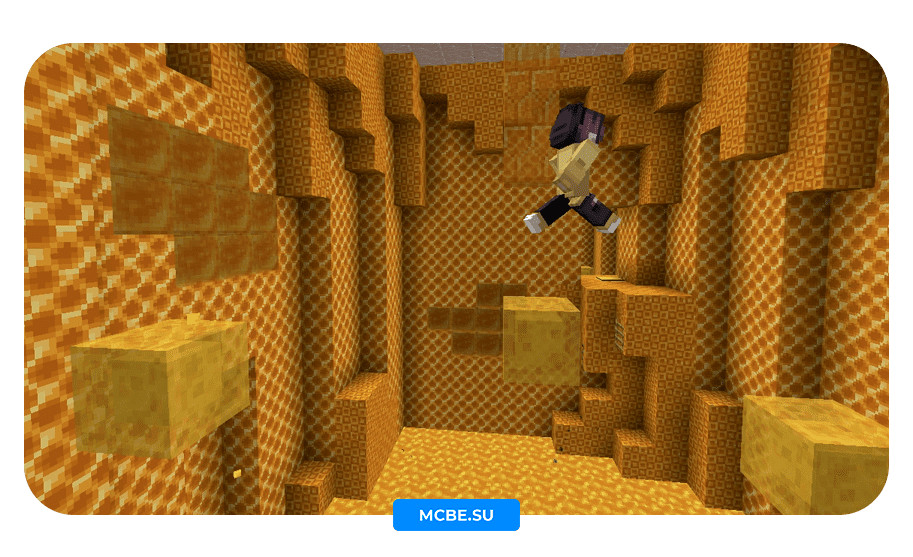 Выша задача дойти до финала карты, проходят паркур по медовым блокам, с помощью новой механики. В Minecraft PE 1.14 появилась возможность цепляться за блоки меда, тем самым медленно скользя по ним.