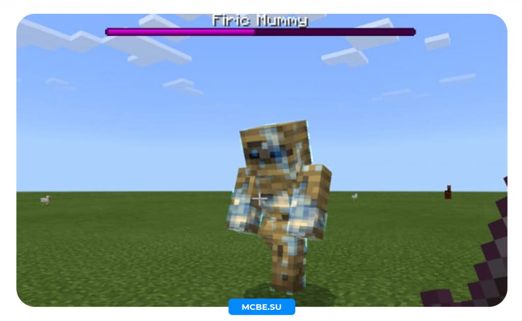 Мумия внутри пирамиды представляет собой нового босса в Minecraft. Босс неподвижен, но способен атаковать ударными волнами, отбрасывая вас назад. Также для атаки босс использует огненные шары. У него 600 единиц здоровья и он получит щит, когда здоровье окажется на половине.